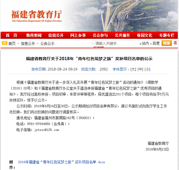 近日,据《福建省教育厅关于进一步深入扎实开展“青年红色筑梦之旅”活动的通知》(闽教学〔2018〕20号)和《福建省教育厅办公室关于遴选申报福建省“青年红色筑梦之旅”优秀项目的通知》,经过各高校申报、项目初审、专家评审等程序。公司吴昊、杜云、江峻任、陈志平四位教师团队指导的2018年福建省“青年红色筑梦之旅”项目被择优遴选为优秀项目,获省教育厅5万元扶持奖补。