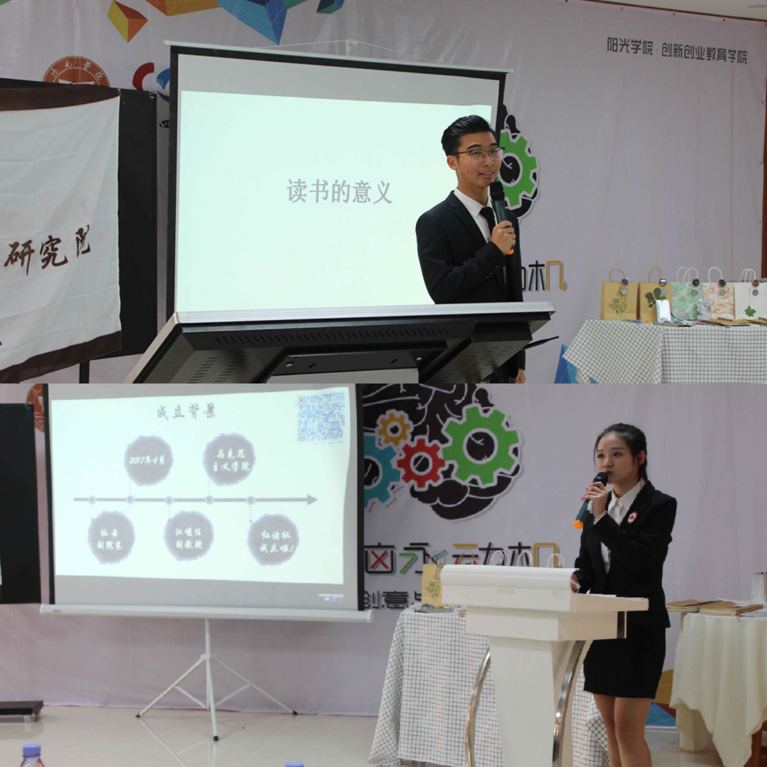 紧接着,习近平新时代中国特色社会主义思想青年读书社社长庄杰同学为大家带来“读书的意义”主题演讲,从自身的实际出发,深情地讲述了他与读书的不解之缘,呼吁同学们做生活中的有心人。随后,国学社的副社长钟京宏通过对于六品徽章、卧龙文集、社徽等社团产品的展示,彰显国学社社团的特色。红色经典读书社副社长刘丽月结合自身感受,指出阅读红色经典可以开阔政治格局、领略革命情怀、明确理想信念、增强爱国情感、凝聚民族自信心。演讲协会的负责人邓诗涵与同学们分享创建协会的心路历程,将“演讲”这一门语言的艺术进行充分的展示;良知社副社长张艾翔利用积分奖励制,为大家开启了一段学习闯关之旅。