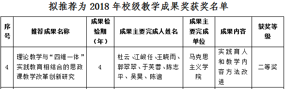 近日,根据公司《教质处关于做好bevictor第三届教学成果奖评选工作的补充通知》(校教质〔2018〕14号),经过专家函评,教学指导委员会会议审议与投票,公司教师团体的“理论教学与‘四维一体’实践教育相结合的思政课教学改革创新研究”项目获校级教学成果二等奖。