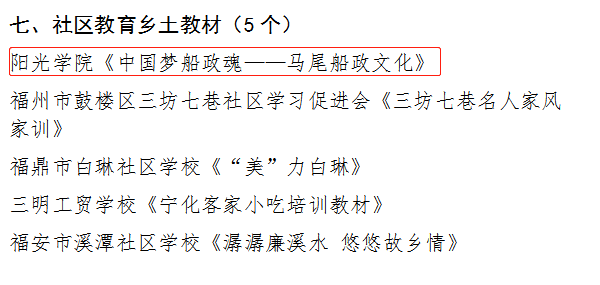 近日,福建省教育厅、福建省财政厅公布2018-2020年福建省终身教育重点建设项目,公司四个项目获得第一批省终身教育重点项目。其中由公司教师团队主编教材《中国梦船政魂——马尾船政文化》项目获批社区教育乡土教材。