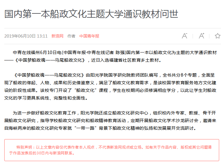 近日,中国青年报报道公司bevictor自编教材《中国梦船政魂——马尾船政文化》入选福建省社区教育乡土教材,成为2020年福建省终身教育重点建设项目,为国内第一本船政文化主题大学通识教材。