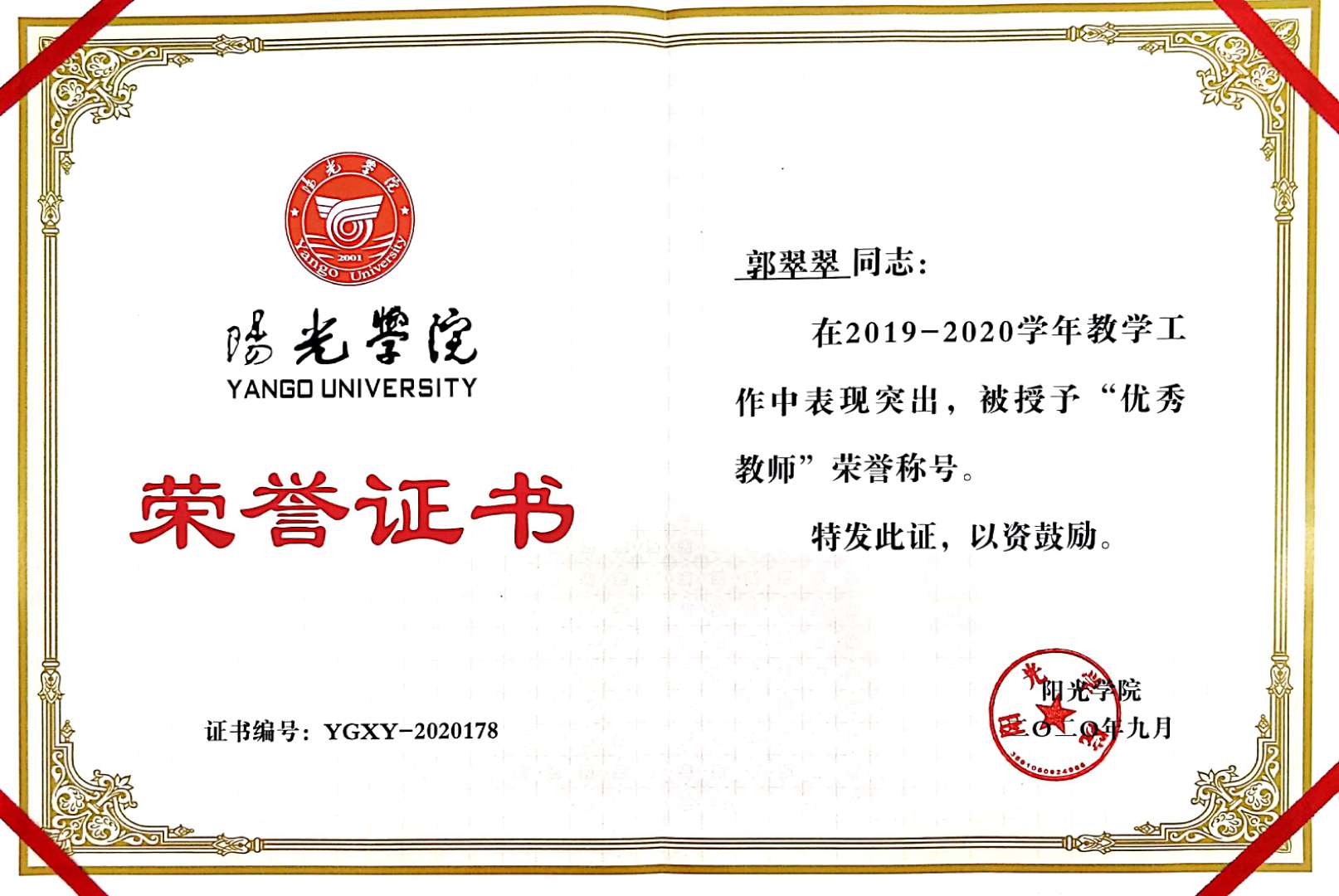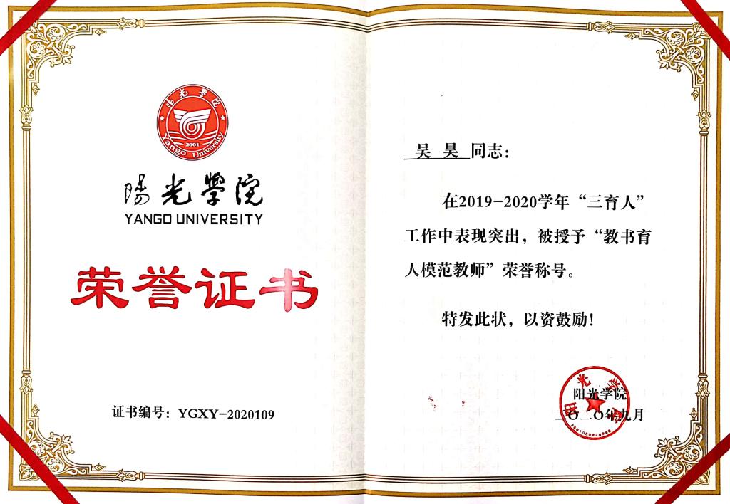 【喜讯】公司教师被评为2019-2020学年bevictor“三育人”先进个人