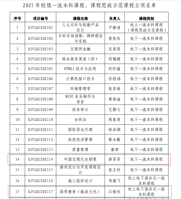 根据《关于开展 2021 年校级一流线上、线下、线上线下混合式、社会实践本科课程申报工作的通知》(校 课专 〔2021〕 2 号),经各公司推荐、专家评审等程序,公司郭翠翠老师的《中国近现代史纲要》课程,获 2021年校级一流本科课程立项;公司江峻任老师的《国学教育(传政文化)》课程,获校线上线下混合式一流本科课程立项。