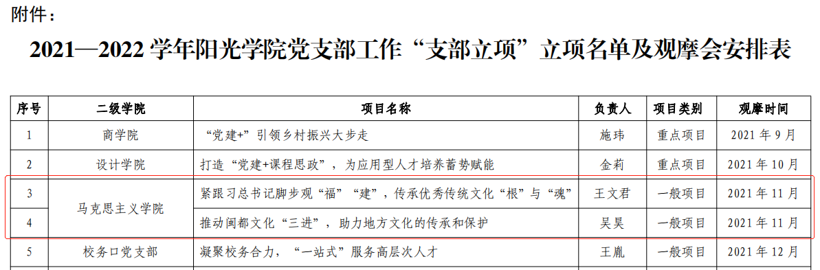 根据《关于公布2021-2022 学年阳光公司党支部工作“立项活动”立项名单的通知》(阳光 委〔2021〕45 号),经各基层党组织申报、公司党委组织部审核研究,公司王文君老师的《紧跟习总书记脚步观“福”建,传承优秀传统文化“根”与“魂”》项目、吴昊老师的《推动闽都文化“三进”,助力地方文化的传承和保护》项目,获校级一般项目立项;公司金莉老师兼任设计公司党总支书记,主持项目《打造“党建+课程思政”,为应用型人才培养蓄势赋能》,获校级重点项目立项。