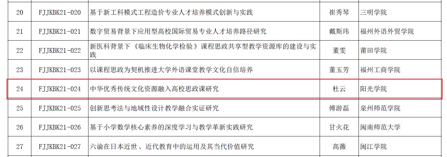 近日,根据《关于公布福建省教育科学“十四五”规划2021年度课题立项结果的通知》,经福建省教育科学规划办的审核评审、网上公示,公司杜云副教授项目获福建省教育科学“十四五”规划2021年度课题立项。