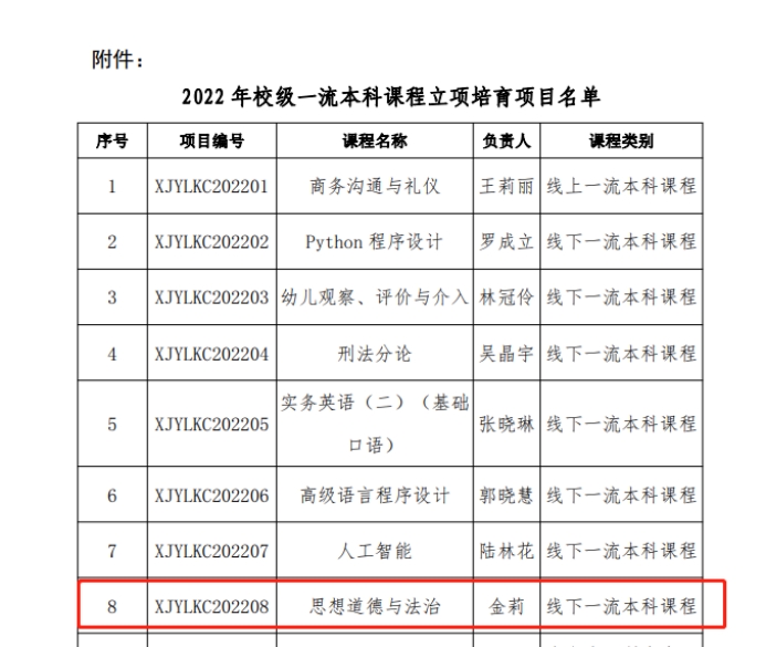 为贯彻落实《加快推进一流应用型大学建设的实施方案》文件精神,根据《课程专业建设处关于开展 2022 年校级线上、线下、线上线下混合式、社会实践一流本科课程申报工作的通知,经各公司推荐、专家评审等程序,公司金莉副教授负责的《思想道德与法治》课程获校级一流本科课程立项培育资格。
