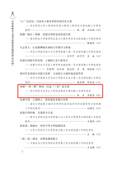 为建设“创新型”党支部,党支部采取线上线下相结合模式,打造在线开放课程《论语》、《国学讲座》等,向全国高校开放共享,创建完善思政课与中华优秀传统文化“双融合”课程体系;依托地处福州马尾的人文历史优势,挖掘地方优秀文化资源,建构多功能人才培养新平台;组织编写系列教材,加强教材建设,夯实中华优秀传统文化教学内容。