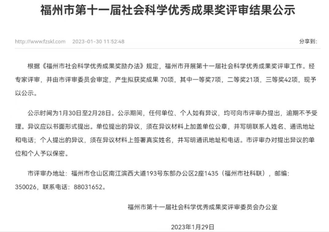 近日,福州市第十一届社会科学优秀成果奖评审委员会办公室公示了社会科学优秀成果奖结果,公司传来喜讯。