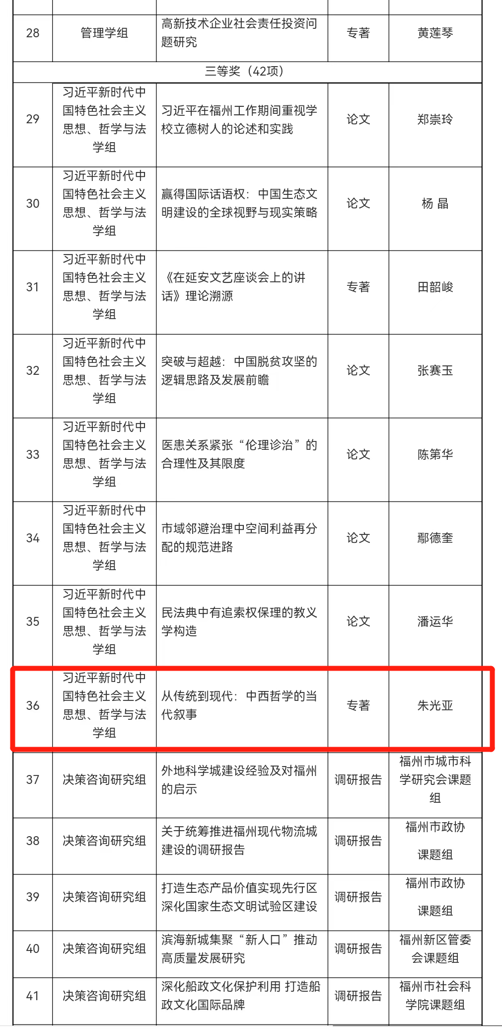 据悉,共产生一等奖7项,二等奖21项,三等奖42项。在其中的三等奖获奖公示名单中,公司朱光亚副教授隶属组别为习近平新时代中国特色社会主义思想、哲学与法学组的“从传统到现代:中西哲学的当代叙事”的专著名列其中。