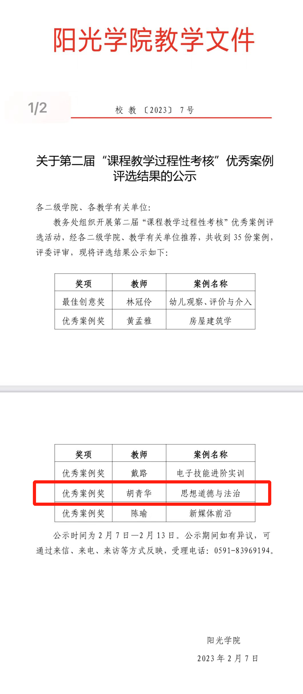 公司组织开展第二届“课程教学过程性考核”,经各单位推荐,共收到35封案例。在近日的公示名单中(公示时间为2月7日-2月13日),共有五位老师获选优秀案例,其中公司的胡青华老师的案例“思想道德与法治”赫然在列。