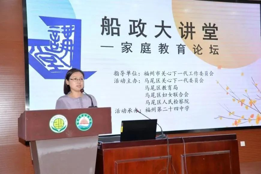 马尾区检察院第一检察部林瑜副主任针对未成年人的相关案件谈论家庭教育的重要性,提出家庭教育中父母行为失范、监护不力、沟通不畅等问题及后果,表示家校社合力是孩子健康成长不可或缺的因素。