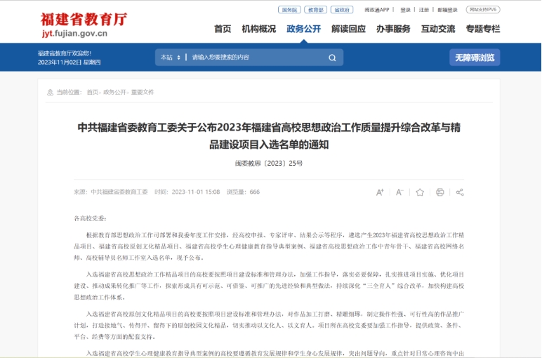 据悉,本次评审经过高校申报、专家评审、结果公示等程序,遴选产生2023年福建省高校思想政治工作精品项目、福建省高校原创文化精品项目、福建省高校员工心理健康教育指导典型案例、福建省高校思想政治工作中青年骨干、福建省高校网络名师、高校辅导员名师工作室等类别。