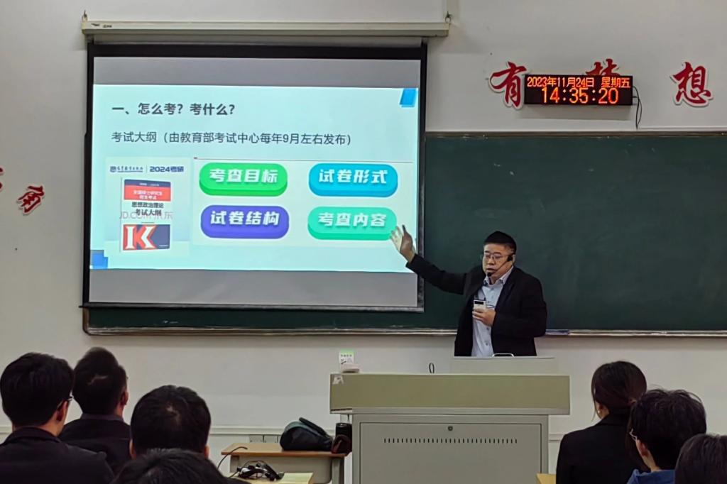 大导师江峻任副教授为在场学子传授备考方法及技巧。他提到在考研准备阶段时,考研学子要对未来有清晰明确的定位规划,积极找寻向下兼容的方式。他指出了解学科类别和具体分支、关注目标院校历年招生情况十分重要。