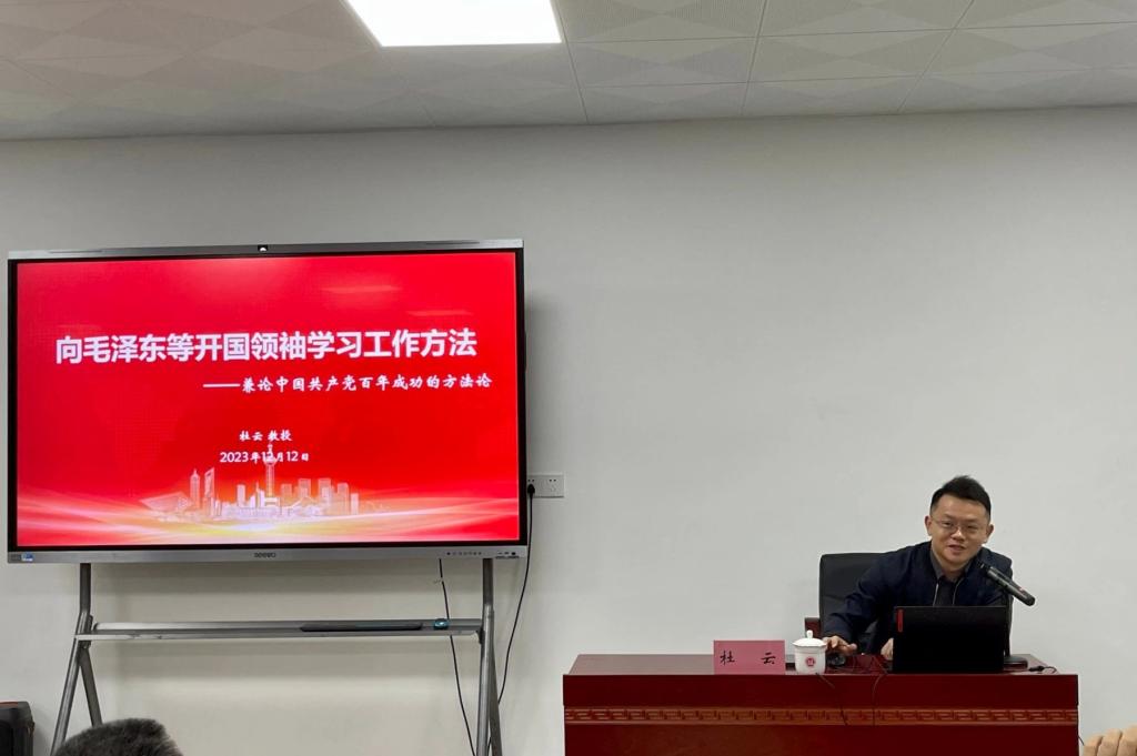 报告会结束后,黄发友书记作总结。他高度肯定了杜云教授的报告:“内容丰富、条理清晰,具有很强的理论性和借鉴性,对我们学习和领会毛泽东等开国领袖的工作方法具有很大的帮助,同时也有利于我们理解和把握中国共产党百年成功的方法论和秘诀。”并勉励在场师生,在新的历史条件下,大家应该充分挖掘、传承毛泽东等开国领袖的工作方法,让它们发挥更大的作用。