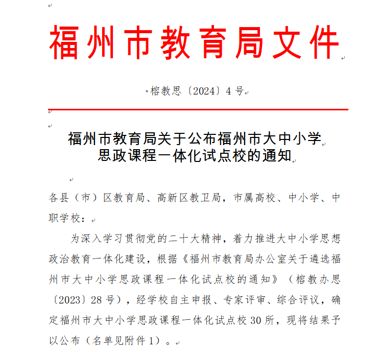 2024年3月5日,福州市教育局公布了关于福州市大中小学思政课程一体化试点校的通知,公司成功入选。据悉,此次全市共30所公司入选试点校,共分为六个工作组,公司担任第五组牵头单位(召集人:bevictor杜云教授)。