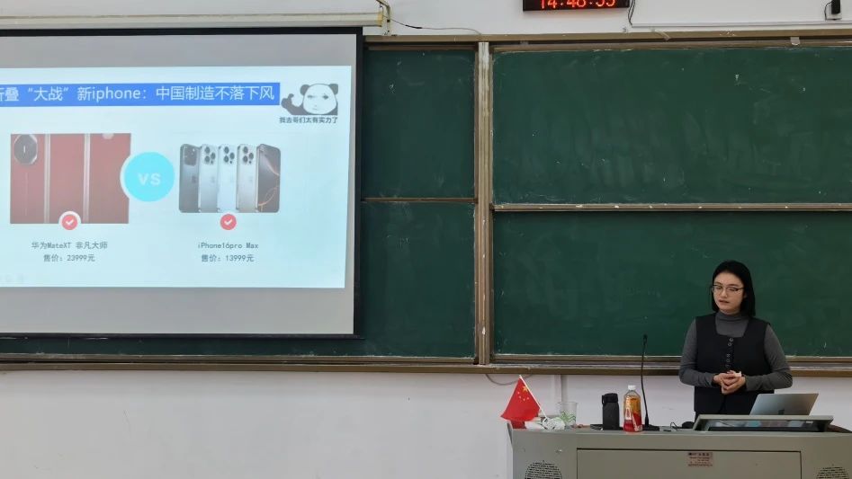 王晶晶老师就第三章加快发展新质生产力进行说课展示。通过华为手机三折叠屏进行导入,从新质生产力新在哪里?怎样发展新质生产力问题?层层递进,进行讲解,其中在课堂上注重互动设计,突出以员工为主体,前后呼应。