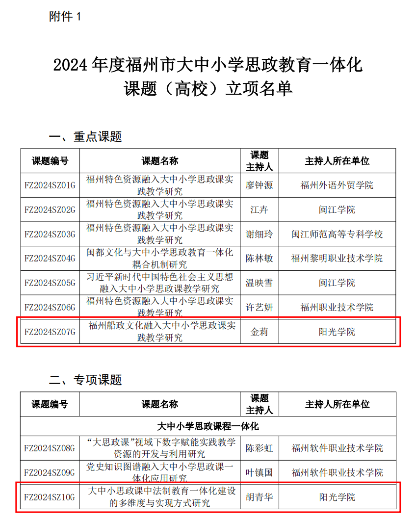 近日,福州市教育局公布了2024年度福州市大中小学思政教育一体化课题(高校)立项名单,公司金莉老师、胡青华老师分别获得重点课题立项和专项课题立项。