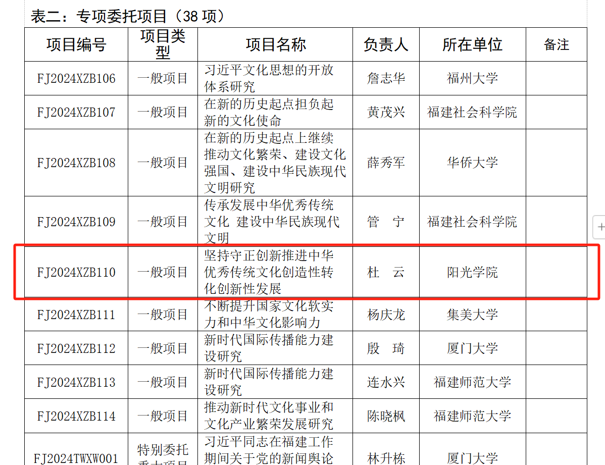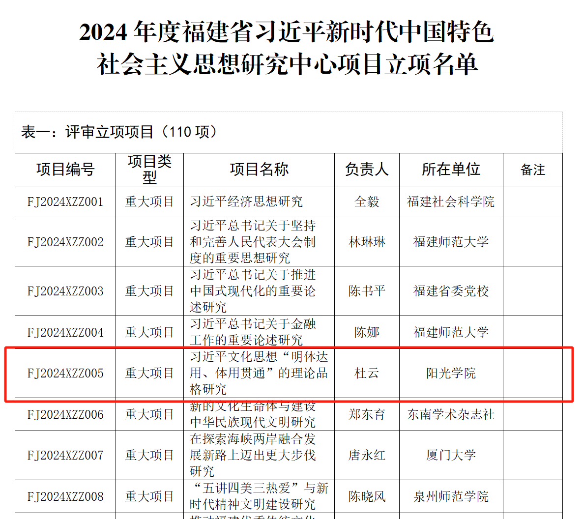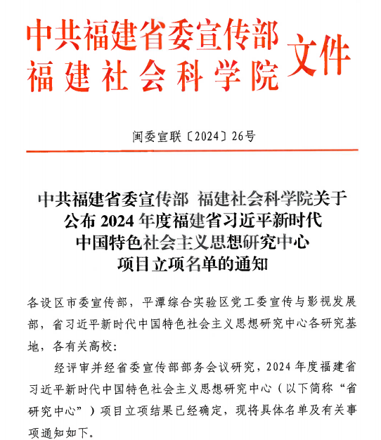 近日,2024年度福建省习近平新时代中国特色社会主义思想研究中心项目立项名单公布,公司获批重大项目1项、专项委托项目1项。杜云教授申报课题《习近平文化思想“明体达用、体用贯通”的理论品格研究》获批重大项目。同时,杜云教授所主持2023年全国宣传思想文化工作会议精神研究阐释课题预立项《坚持守正创新推进中华优秀传统文化创造性转化创新性发展》(学理化研究)已完成阶段性研究成果发表,本次获正式立项。