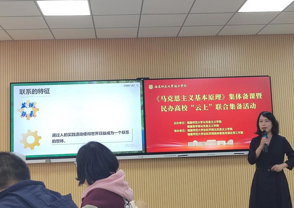 2024年12月11日,公司马克思主义基本原理课程组教师江峻任、郭翠翠、廖孝英、陈晨、富钰莹、黄文媛几位老师参加了由福建师范大学协和公司bevictor主办的唯物辩证法的总特征——《马克思主义基本原理》集备暨民办高校“云上”联合集备活动。本次活动旨在进一步加强民办高校与公办高校的交流合作,促进思政课优质资源多方共享,联合提升教学质量与创新能力。