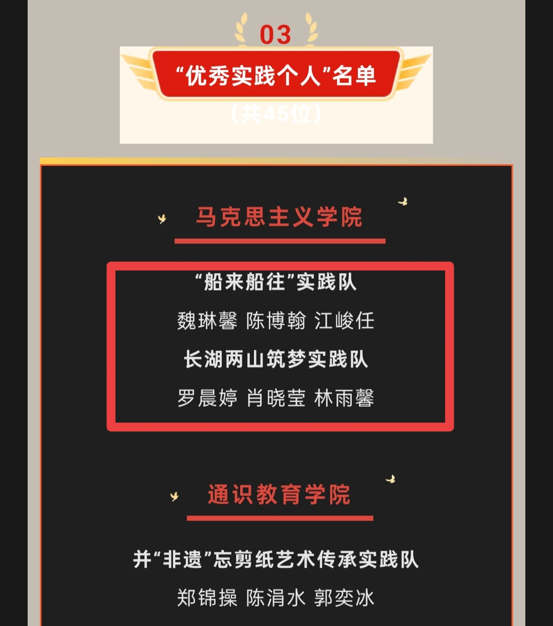 江峻任、肖晓莹老师,习近平新时代中国特色社会主义思想读书社骨干罗晨婷、林雨馨、魏琳馨、陈博翰同学获校级“优秀实践个人”荣誉称号。