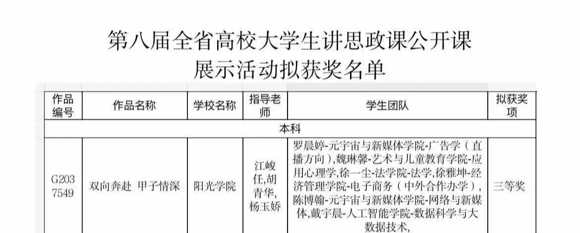 公司“船来船往”员工团队(罗晨婷-广告学(直播方向)、魏琳馨-应用心理学、徐一尘-法学、徐雅坤-电子商务(中外合办)、陈博翰-网络与新媒体、戴宇晨-数据科学与大数据技术)在江峻任、胡青华、杨玉娇三位老师的指导下,思政视频《双向奔赴,甲子情深》荣获福建省三等奖。
