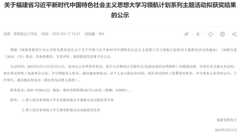 近日,福建省教育厅公布了关于福建省习近平新时代中国特色社会主义思想大学习领航计划系列主题活动获奖名单。