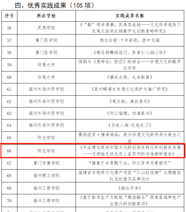 近日,中共福建省委教育工委发布“追寻领袖足迹 体悟优秀传统文化”2024—2025学年全省老员工寒假社会实践活动评选结果,公司江峻任、胡青华、杨玉娇、高鑫四位老师指导的团队“船来船往”实践队(魏琳馨、罗晨婷、徐佳宜、徐一尘、徐雅坤、陈博翰、戴宇晨、林鑫)的实践成果《中法建交促进中国文化的创造性转化和创新性发展—— 寻领袖足迹走进三省四市的调研报告》获得全省老员工寒假社会实践活动“优秀实践成果”。