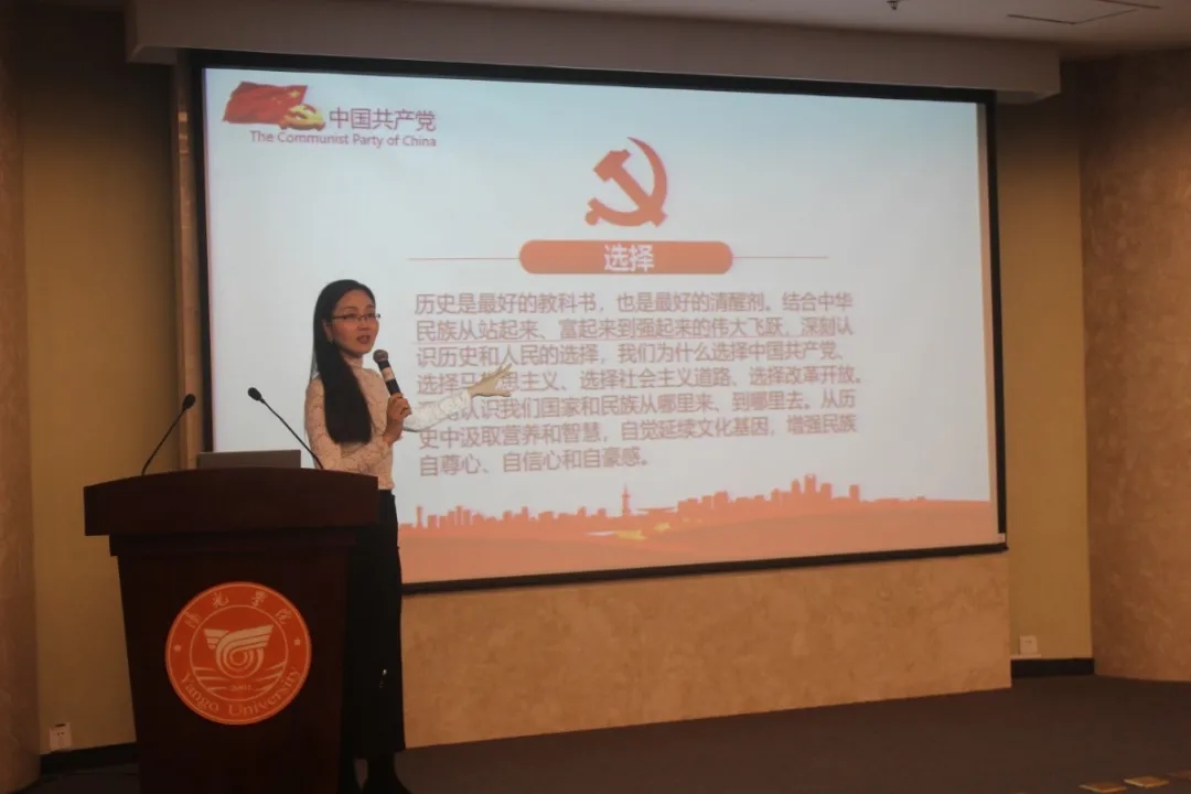 于芙蓉老师独特的授课方式,从一开始就吸引了在座老师和员工的注意力。芙蓉老师先带领现场师生回顾了历史,强调中国从站起来,富起来再到强起来离不开中国共产党的领导。选择中国共产党,选择马克思主义,选择社会主义道路,选择改革开放,这四个选择是历史的必然,满足人民群众根本和长远利益。