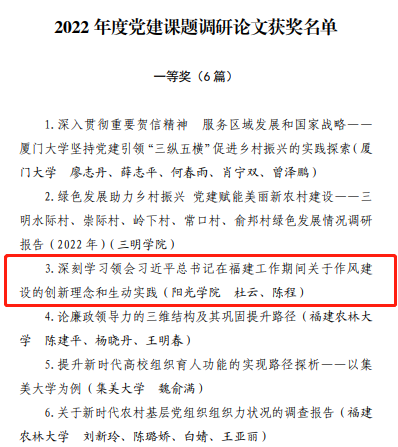 近日,福建省委教育工委公布了2022年度党建课题调研论文评选结果,我支部申报的党建课题调研论文《深刻学习领会习近平总书记在福建工作期间关于作风建设的创新理念和生动实践》(杜云,陈程)荣获省级一等奖(民办高校唯一)。
