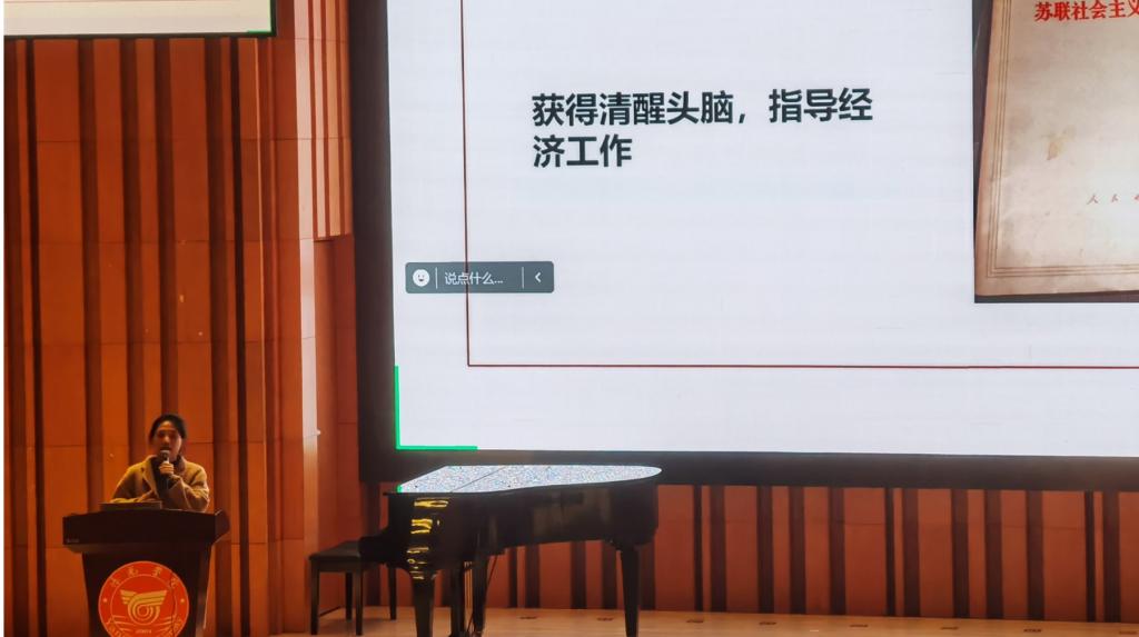 “立身以立学为先,立学以读书为本。”党课尾声,肖晓莹老师以毛泽东同志在生命最后的岁月里对待读书的态度结尾,“看书11 次,共2小时50分钟”,这几个数字深深触动了在场学子的心灵。她叮嘱在场学子:要学透、悟透伟大领袖毛泽东同志的读书方法及内涵,便能找到书中的“黄金屋”。